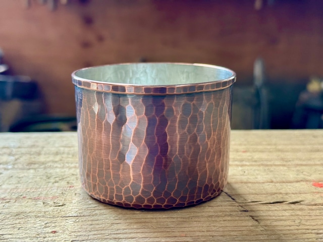 直作銅製 鎚目コップ400ml 【vintage style】 銅板を接合、成型、仕上げ打ち、内側に錫引を引き、表面は色付け加工を行い、手作業でひとつひとつ仕上げられた製品となります。 ビール、ハイボール、アイスコーヒーなど、様々な飲み物にご使用頂けます。 銅による熱の伝わり、錫引き加工による柔らかな口当たり、銅の熱伝導は特に良い為、良く冷やしたビールを注いだ瞬間から本体もよく冷え冷たい口当たりも感じられます。 本体が薄いのでシャープな飲み口もお楽しみ頂けるかと思います。 経年劣化変化により、一層深い色合いの変化などもお楽しみ頂けましたら幸いです。 ・上口 約8.5㎝ ・高さ 約12㎝ ・容量 約400ml 手作業にて製作の為、サイズ、容量などに数ミリ、数ml前後の誤差、製造による細かな傷などがある事が御座います。 •お手入れ 柔らかいスポンジに中性洗剤にて内側、外側を軽く洗い、水分をよく拭き取り、乾燥させてから保管して下さい。内側を荒目(硬い)ナイロンスポンジで強く洗いますと錫が剥がれる事が有ります。外側も強く磨きますとビンテージ色が薄くなる事があります。 内側、外側共に力をかけずに柔らかいスポンジで軽く洗う事をおすすめ致します。 •使用上の注意 長時間飲み物を入れたままの状態は出来る限り避けて下さい。 又、強い酸性、アルカリ性の物を長時間入れたままにしないで下さい。(腐食の原因となります) 食洗機のご使用は変色の原因となりますのでおやめ下さい。 銅は熱伝導が良い為、温かい飲み物でご使用の際は、火傷の原因となる為、熱すぎない様に注意が必要となります。 •修理 長年ご使用して内側の錫の剥がれ、変形などが有りましたら、可能な限り修理にも対応させて頂きます。(有料) •発送 購入頂きましてから発送迄に、約1週間前後のお時間を頂く事がございます。尚、受注生産の場合は1〜2ヶ月程お時間を頂きます(製作状況により前後する事があります) 以上を御承知の上、御購入お願い致します。 ※製造、コストなどを理由に予告無しでの形状、仕様の変更、生産中止になる事も御座います。