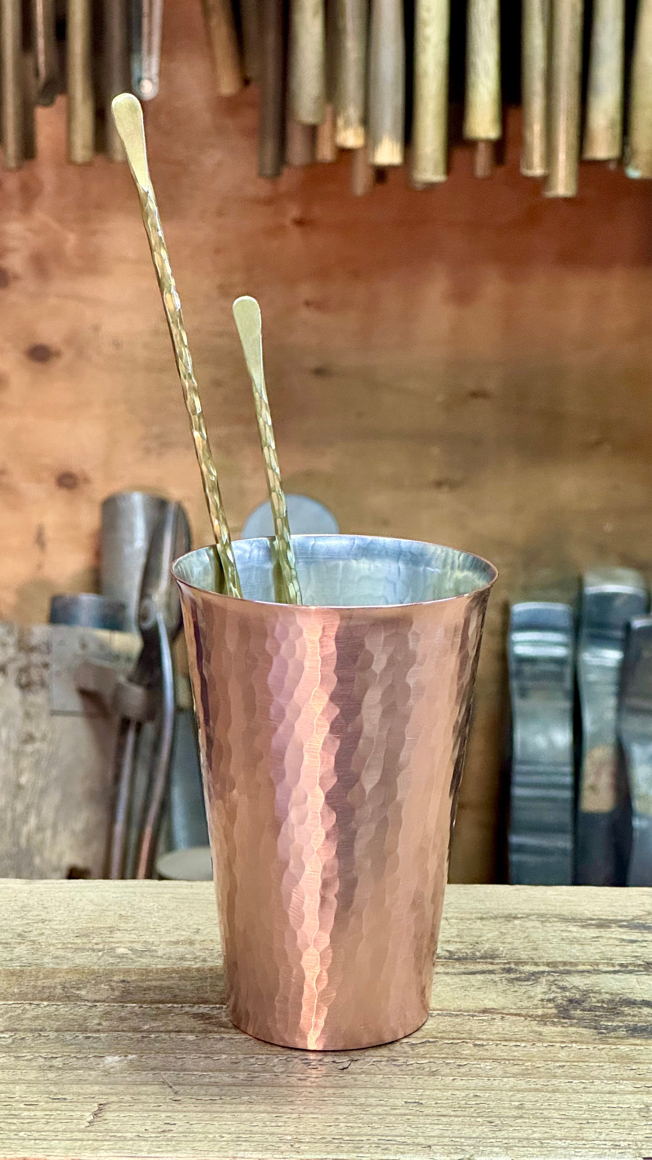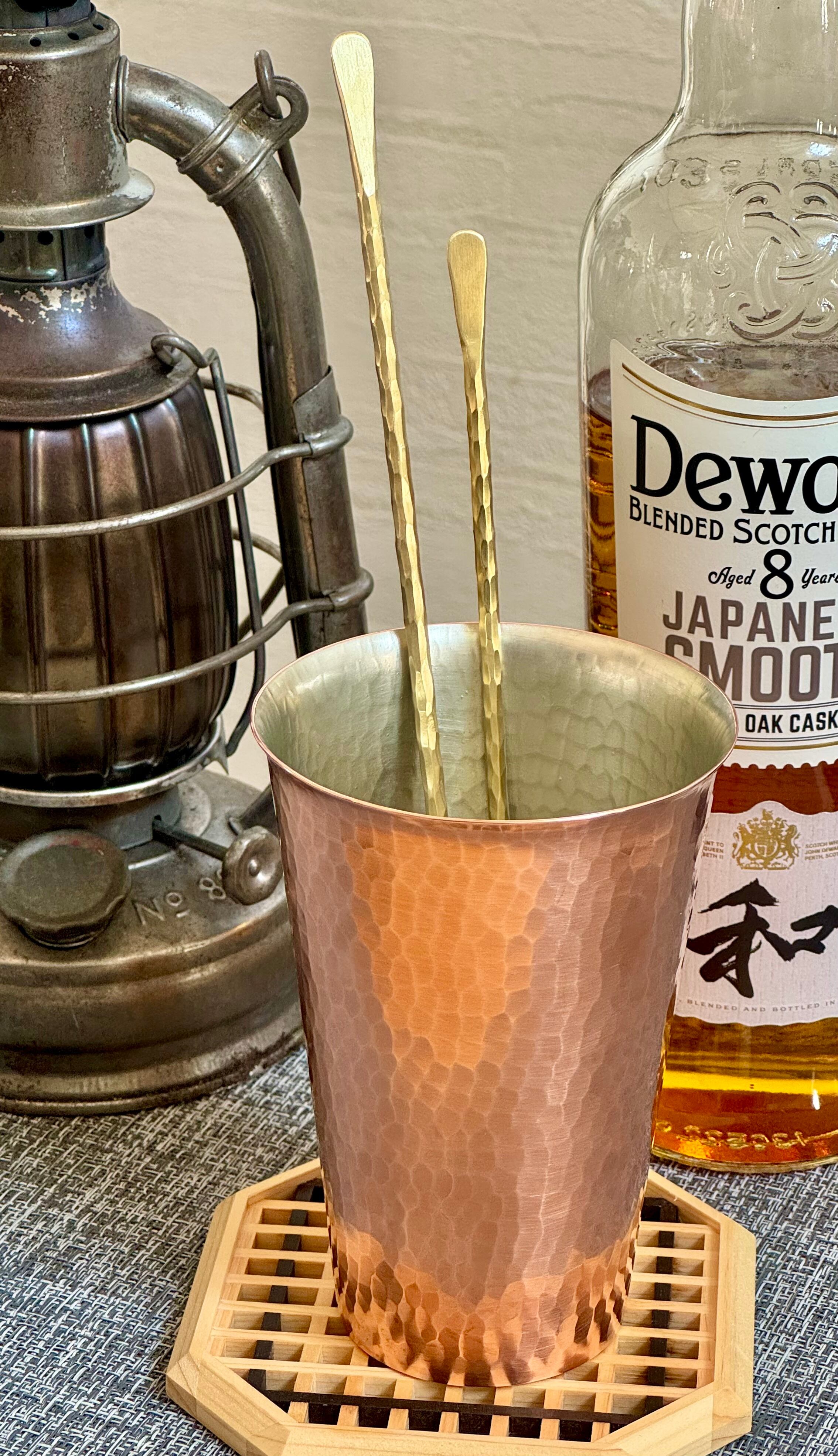 鍛金技法により1本の真鍮丸棒から、ひとつひとつ手作業にて制作いたしました製品となります。ハイボールを作る際に炭酸が抜けにくい様、炭酸水をゆっくり注ぎ、氷を優しく上下することで混ぜる事が出来る角度にスプーンを調整し、仕上げました。インドア、アウトドなどでいつもとは違う特別なハイボールをお楽しみ下さいませ。