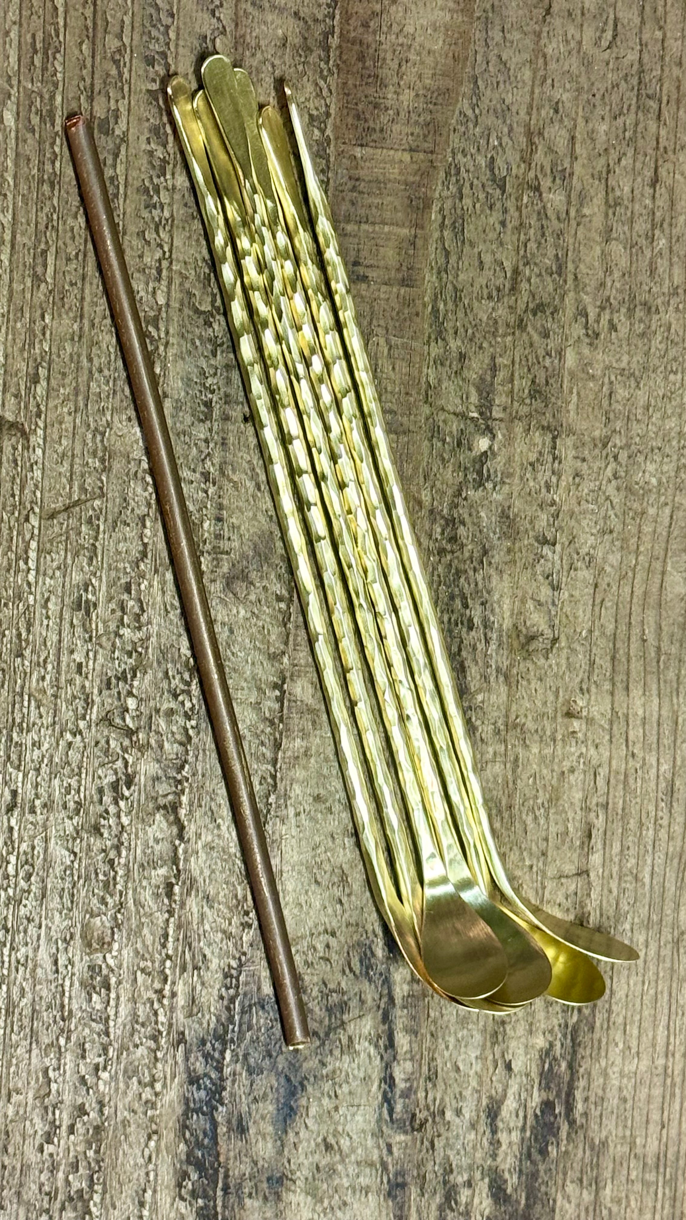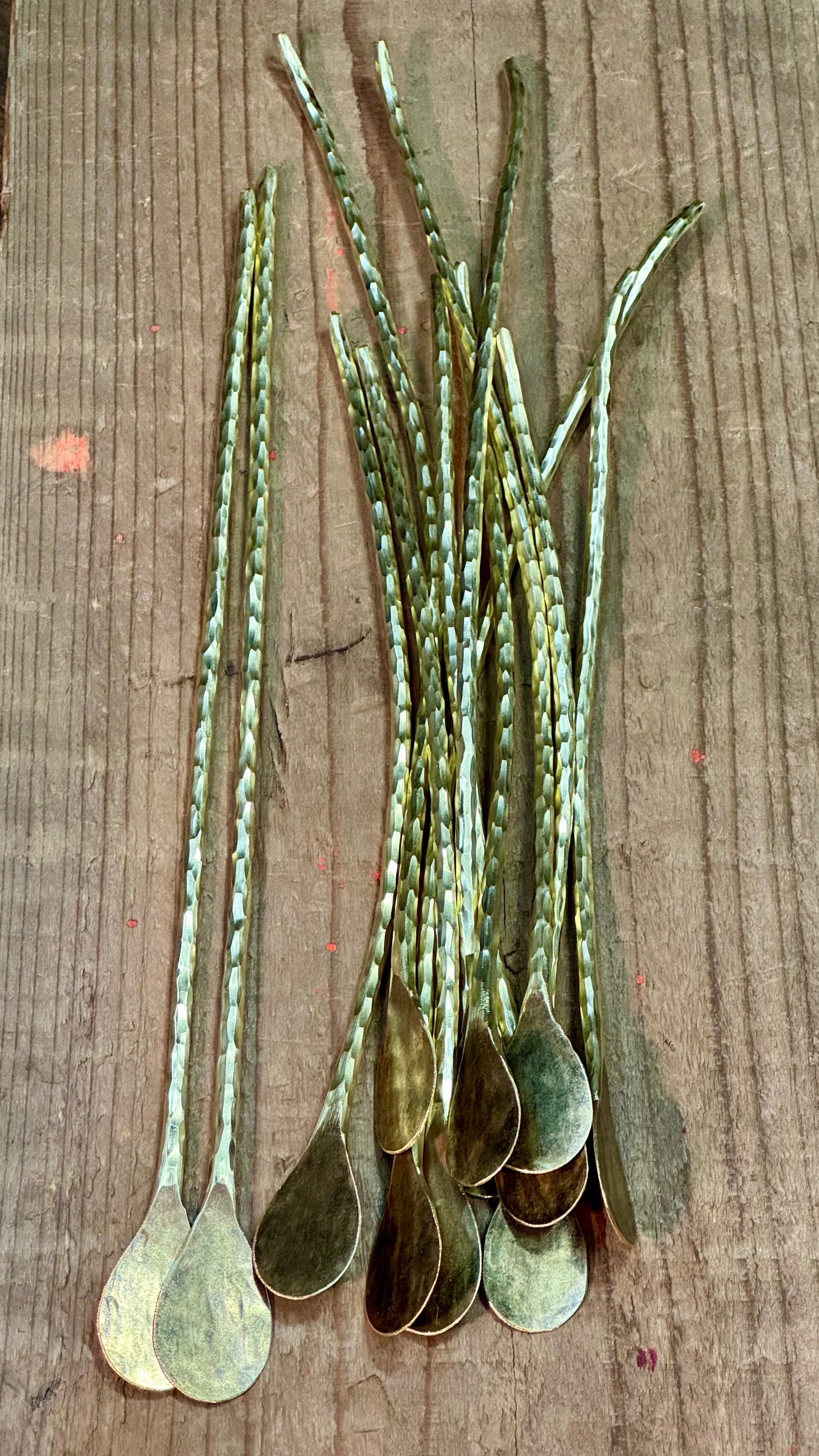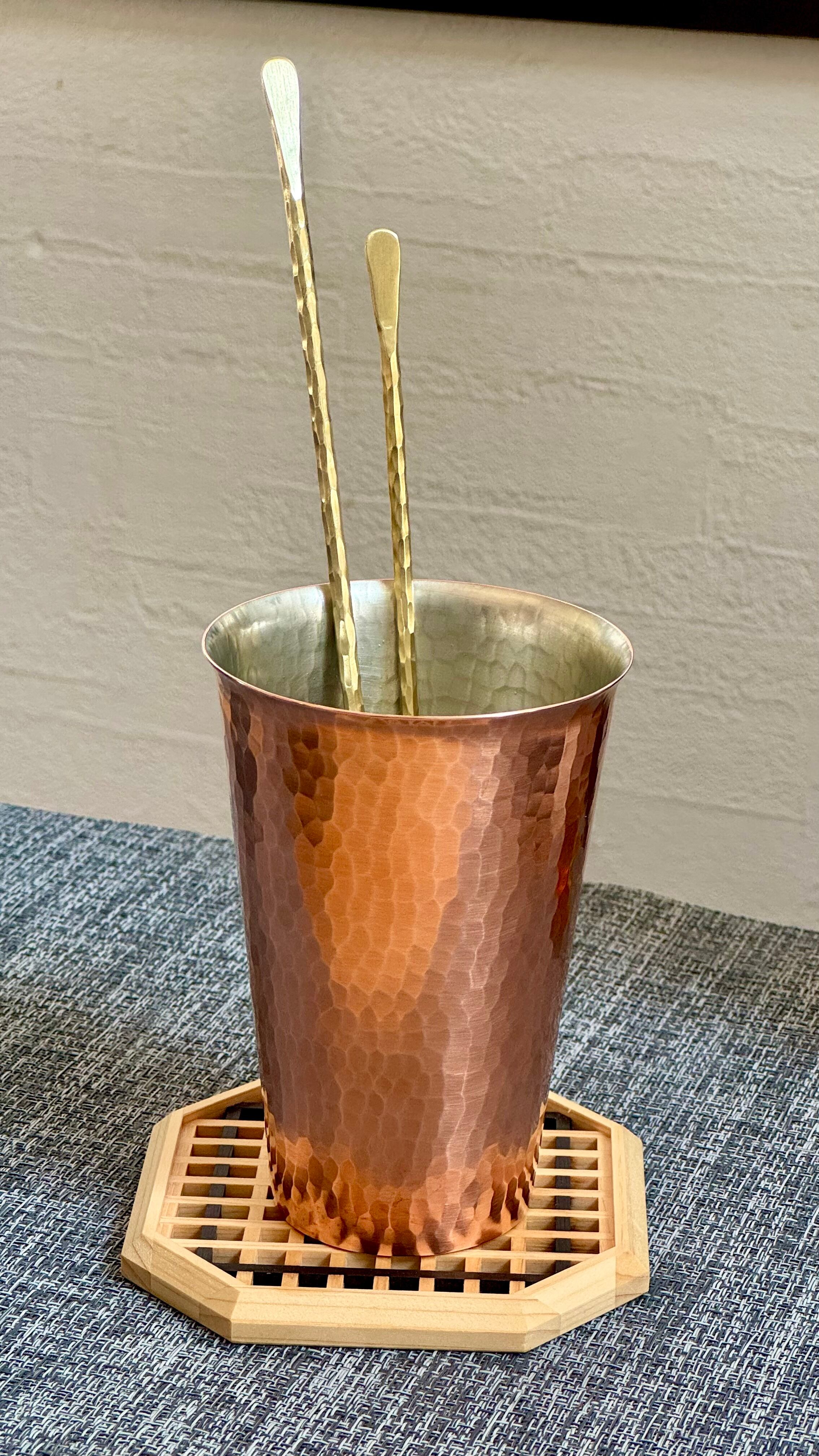 鍛金技法により、1本の真鍮丸棒から、ひとつひとつ手作業にて制作いたしました製品となります。ハイボールを作る際に炭酸が抜けにくい様、炭酸水をゆっくり注ぎ、氷を優しく上下することで混ぜる事が出来る角度にスプーンを調整し、仕上げました製品となります。インドア、アウトドなどでいつもとは違う特別なハイボールをお楽しみ下さいませ。